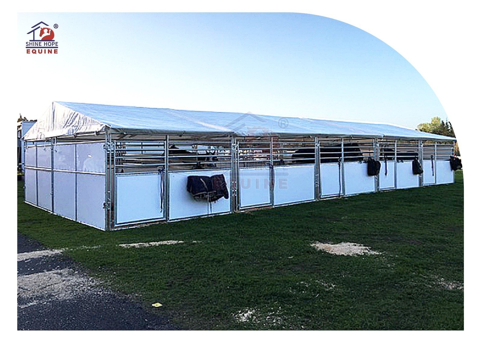 تم تصميم أكشاك الخيول المحمولة واسطبلات الخيول المحمولة من ShineHope Equine مع مراعاة الأداء الوظيفي والمتانة وسهولة الاستخدام. عادةً ما تكون هياكل الأكشاك المحمولة هذه مصنوعة من مواد متينة تضمن القوة وطول العمر. فهي سهلة التجميع والتفكيك والنقل، وهي شائعة الاستخدام في عروض الخيول وفعاليات الخيول وتخييم الخيول.